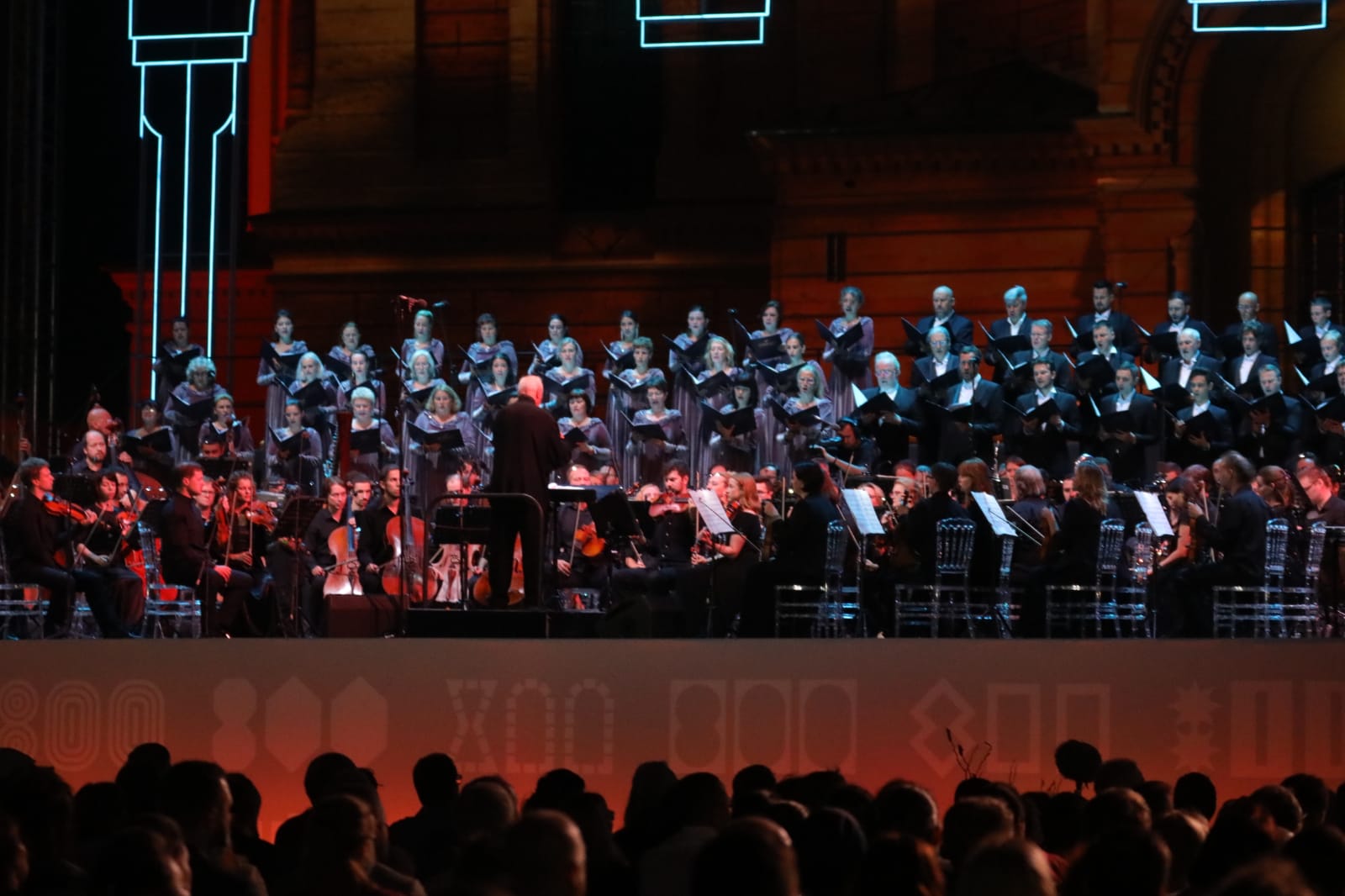 Симфонический оркестр и Государственная академическая капелла Санкт-Петербурга под управлением дирижера – народного артиста СССР Владислава Чернушенко исполнили кантату, произведения М.А. Балакирева "Экспромт" и П.И. Чайковского "1812". Среди солистов были победитель Международного юношеского конкурса им. Чайковского Мария Андреева (скрипка) и заслуженная артистка России Дарья Лейбова (меццо-сопрано).