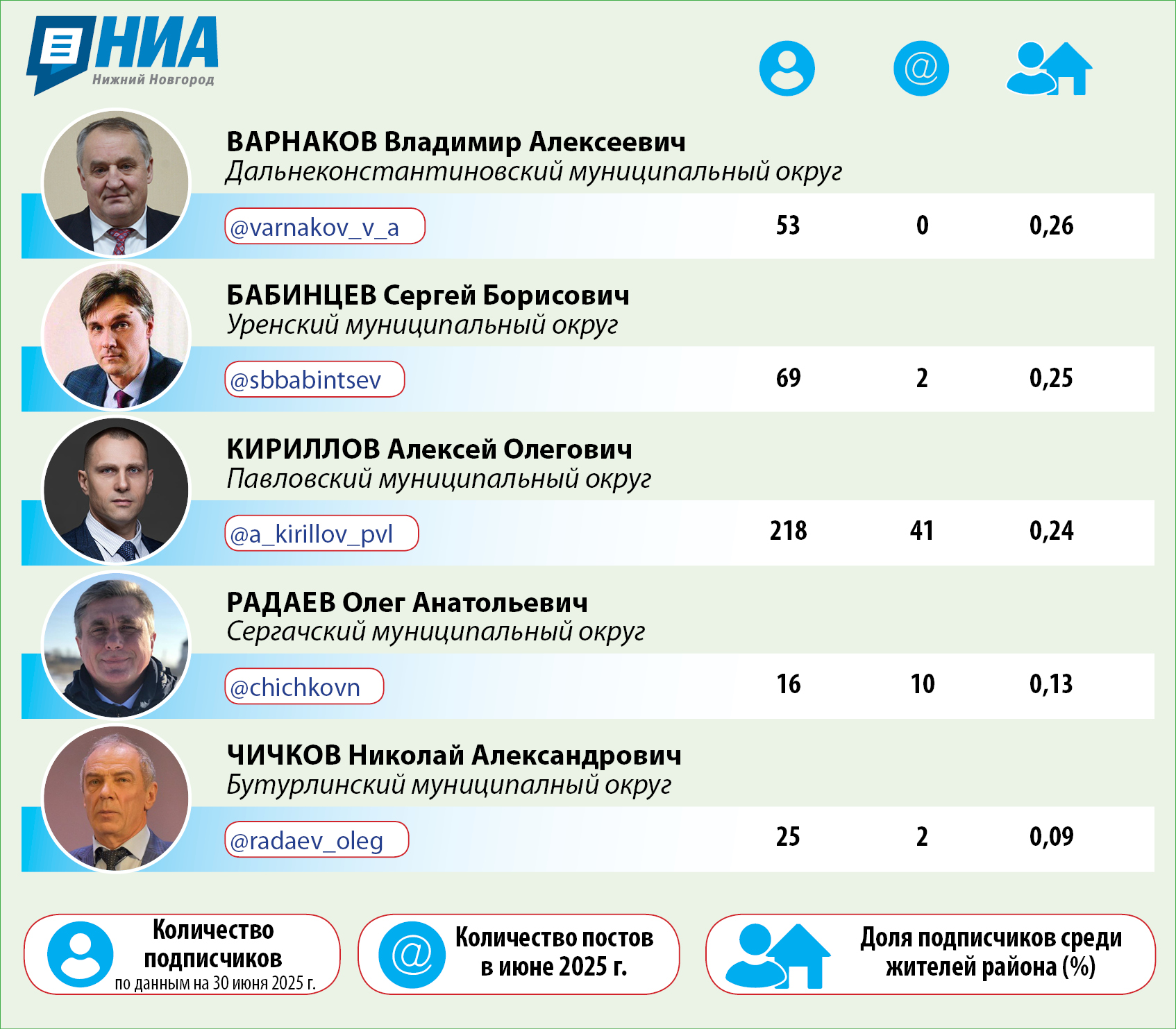 1. Юрий Шалабаев — 9769 подписчиков, 31 пост в июне 2025 года, средний охват одного поста — 6492, население муниципалитета — 1 222 122 человек, доля подписчиков — 0,80%.