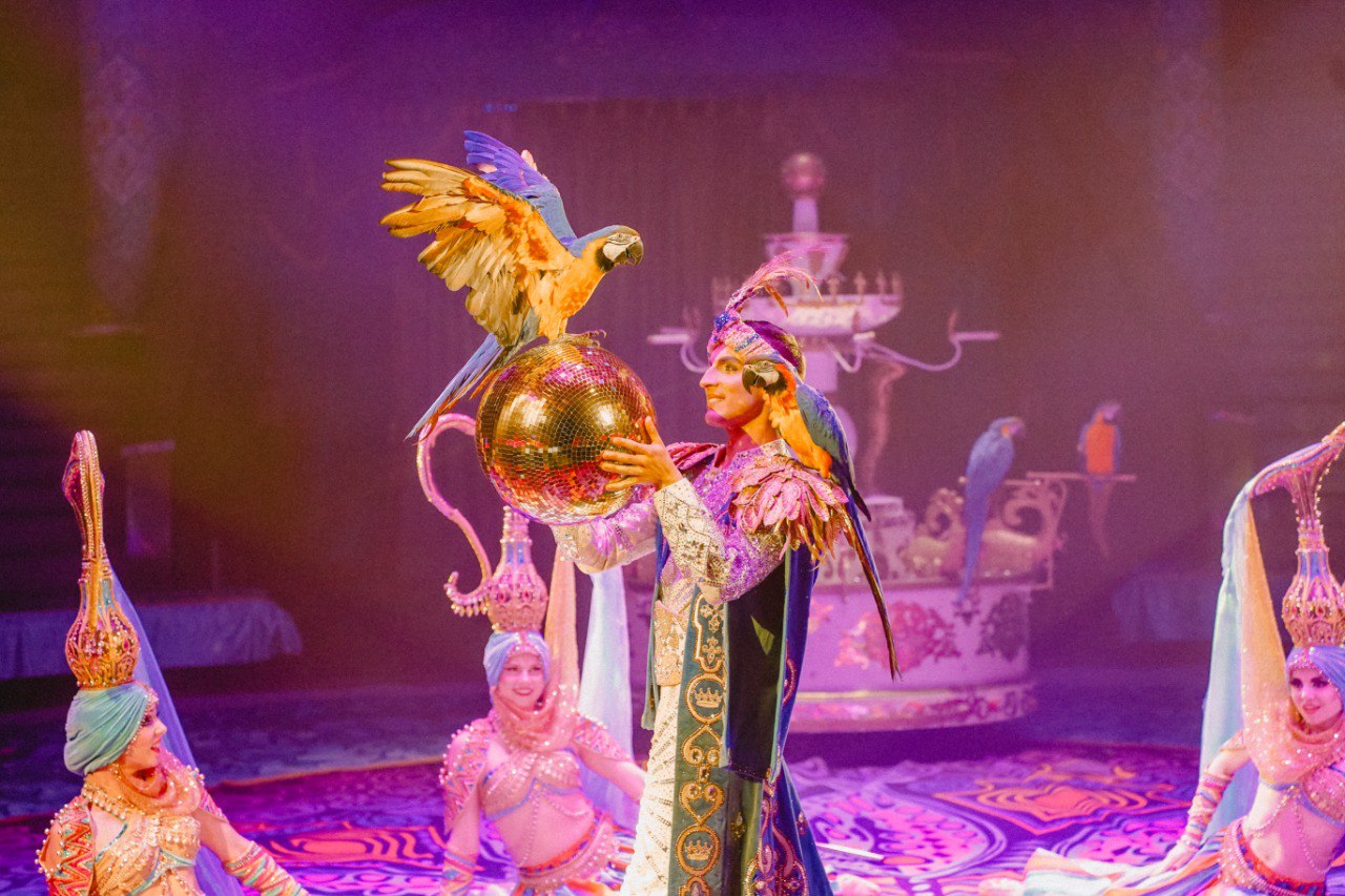 Отдельное внимание в спектакле конечно же уделено животным. В программе задействованы семь верблюдов, двадцать собак, четыре пеликана, три обезьяны, шесть лошадей, попугаи и другие представители фауны.
