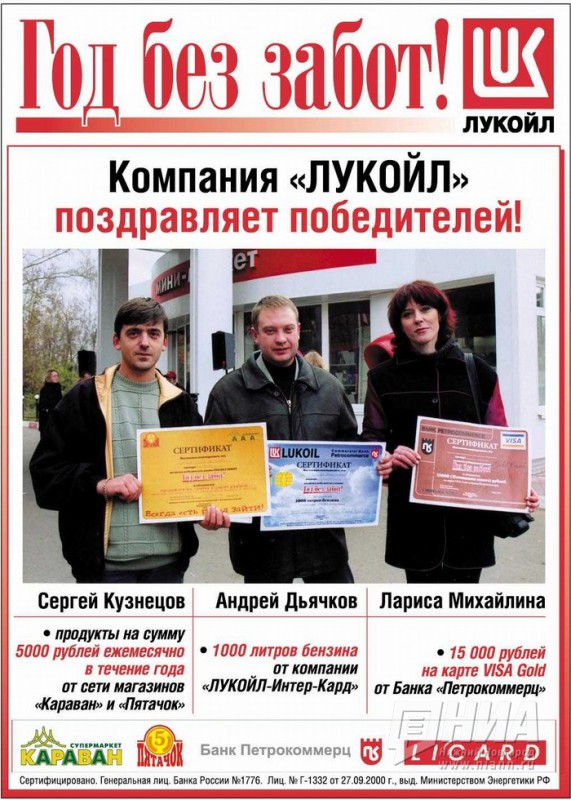 Андрей Дьячков, выигравший 1 тыс. литров бензина А-95 от компании ЛУКОЙЛ-Интер-Кард, Лариса Михайлина, выигравшая 15 тыс. рублей на карте VISA-Gold от Банка "Петрокоммерц", Сергей Кузнецов, выигравший продукты на сумму 5 тыс. рублей ежемесячно в течение года от сети магазинов "Караван" и "Пятачок".
