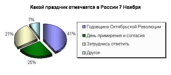 Согласно полученным данным только четверть нижегородцев знает, что 7 ноября – это День примирения и согласия, 41% горожан по-прежнему считают, что в этот день россияне отмечают праздник годовщины Великой Октябрьской Социалистической Революции. Интересно отметить, что 32% опрошенных нижегородцев вообще не знают, что это за праздник (27% затруднились ответить, а 7% назвали такие праздники как День конституции, День независимости, День труда и др.).