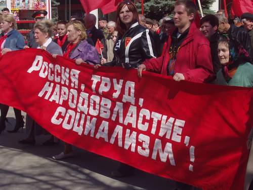 Участники колонной пройдут до пл. Ленина, где пройдет митинг в честь 1 мая. Демонстранты развернули транспаранты с лозунгами "Россия, труд, народовластие, социализм", "Да здравствует 1 мая!", "КПРФ – партия труда!"