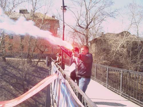 После этого нацболы, вывесившие растяжку, ударились в бегство, опасаясь преследования милиции. Сотрудники милиции, сопровождающие колонну демонстрантов, в настоящее время снимают растяжку.