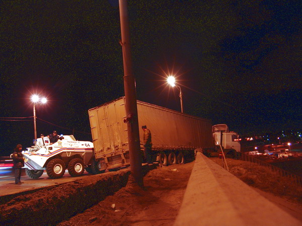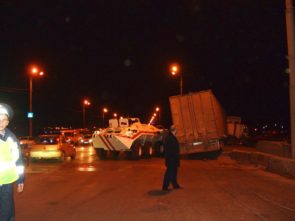 Несколько раз тягач пытались вытянуть на проезжую часть при помощи БТРа