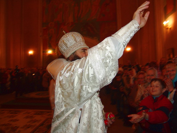 Архиепископ Нижегородский и Арзамасский Георгий дарит прихожанам пасхальные яйца – главный символ наступившего праздника
