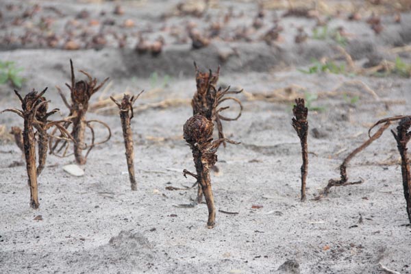 На участках местами остались остатки сгоревших домов, в основном печные трубы