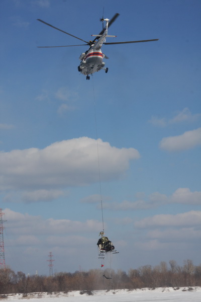 Вертолет был зафиксирован при помощи тросов и веревок, но при попытке выдернуть его при помощи колесного трактора, лопнул основной трос. Сам вертолет находится на плаву благодаря надувным подушкам.