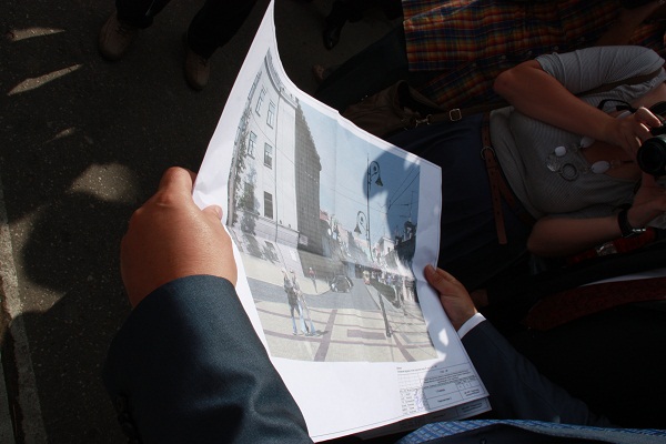 Глава администрации изучает эскизы благоустройства улицы Рождественской, предложенный координаторами проекта Рождественская сторона