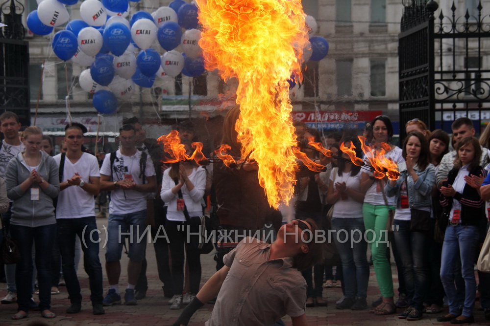 Хранители огня Универсиады на главной площади Нижнего Новгорода
