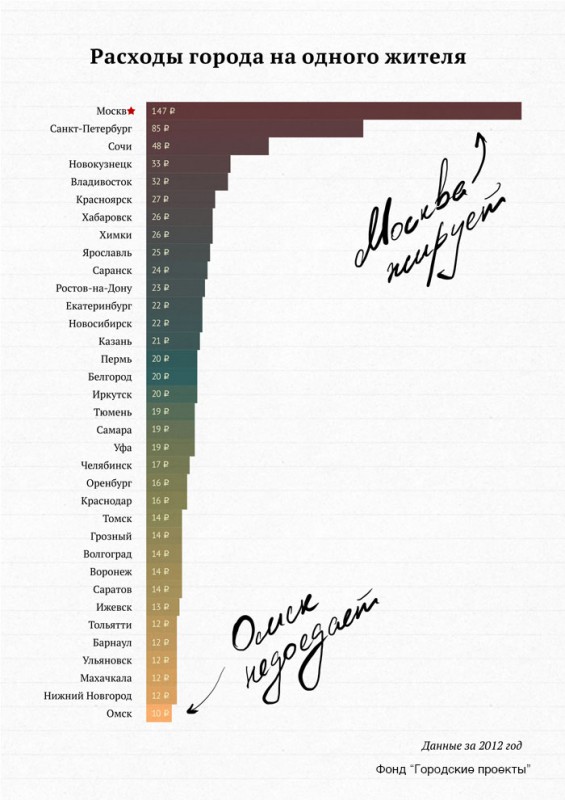 Согласно подсчетам блогера, наибольшие расходы на одного жителя в 2012 году были у бюджетов Москвы (147 тысяч рублей), Санкт-Петербурга (85 тысяч рублей), Сочи (48 тысяч рублей).