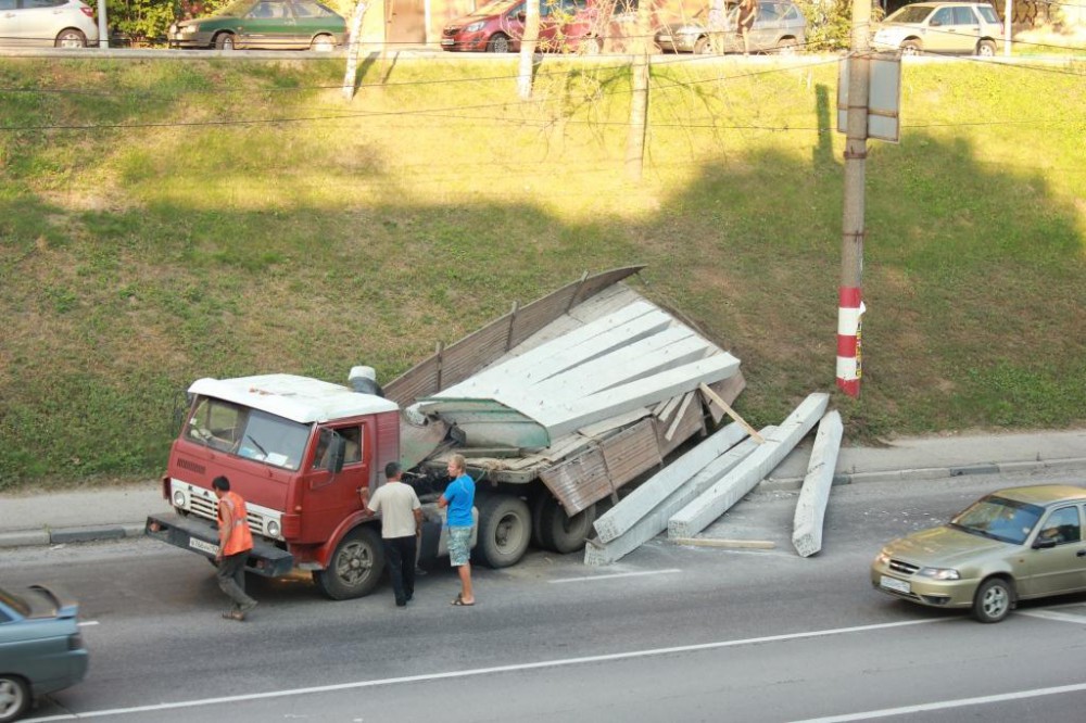Согласно свидетельствам очевидцев, "КамАЗ" откатился назад на светофоре, после чего вывернул прицеп в сторону откоса. В результате из прицепа на проезжую часть высыпались бетонные сваи.