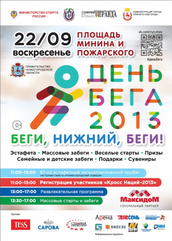 Фестиваль "День Бега" объединит в себе два ежегодных, давно полюбившихся нижегородцам, масштабных спортивных праздника: "Кросс Наций", проводящийся одновременно на всей территории России, и 87-й легко-атлетический эстафетный пробег на призы газеты "Нижегородская правда". Ожидается около 10 000 участников спортивных мероприятий.