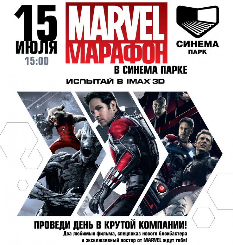 Также гостей мероприятия ожидает предварительный показ фантастического блокбастера "Человек-муравей" за день до выхода картины в национальный прокат. Кроме того, гости киномарафона в Синема Парке получат подарок с символикой Marvel.