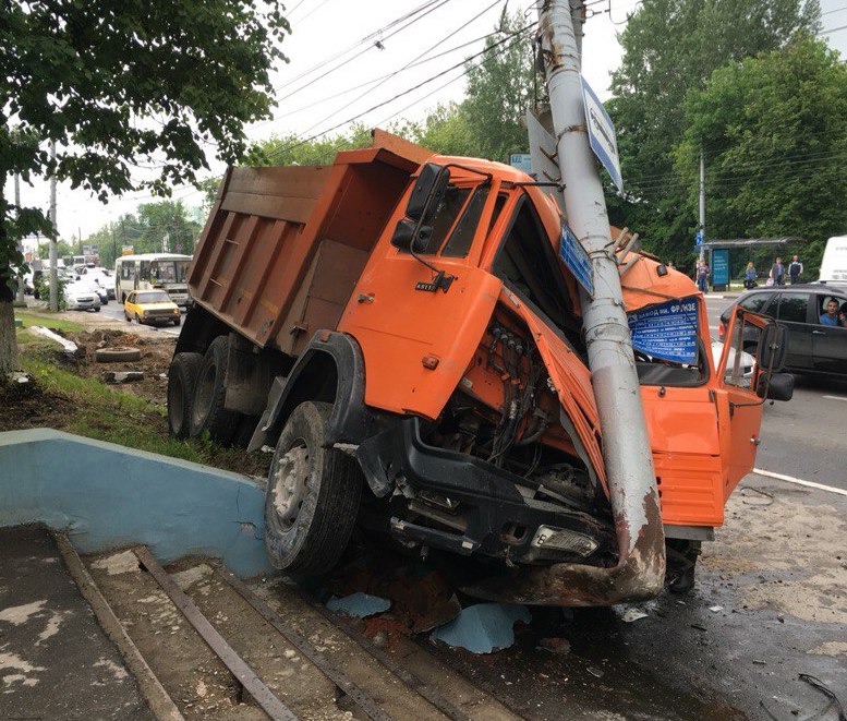 Согласно информации, авария произошла около 17:00 в районе завода им. Фрунзе на проспекте Гагарина. По предварительным данным, у грузовой машины отказали тормоза и водитель не справился с ее управлением. В результате транспортное средство врезалось в световую опору, повредив ее и кабину.