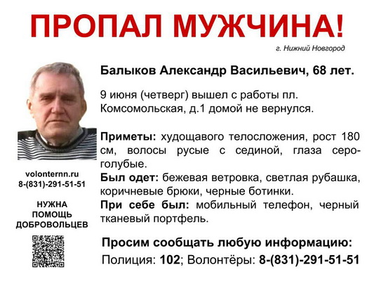 Волонтеры просят помощи в поисках пропавшего 9 июня 2016 года в Нижнем Новгороде 68-летнего Александра Балыкова. Об этом сообщает поисково-спасательный отряд "Волонтер".