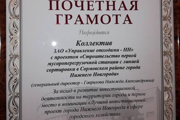 ЗАО "Управление отходами-НН" стало победителем в конкурсе "Лучший инвестиционный проект города Нижнего Новгорода 2016 года" в номинации "Городское хозяйство". Об этом сообщает пресс-служба компании 8 июня 2017 года.