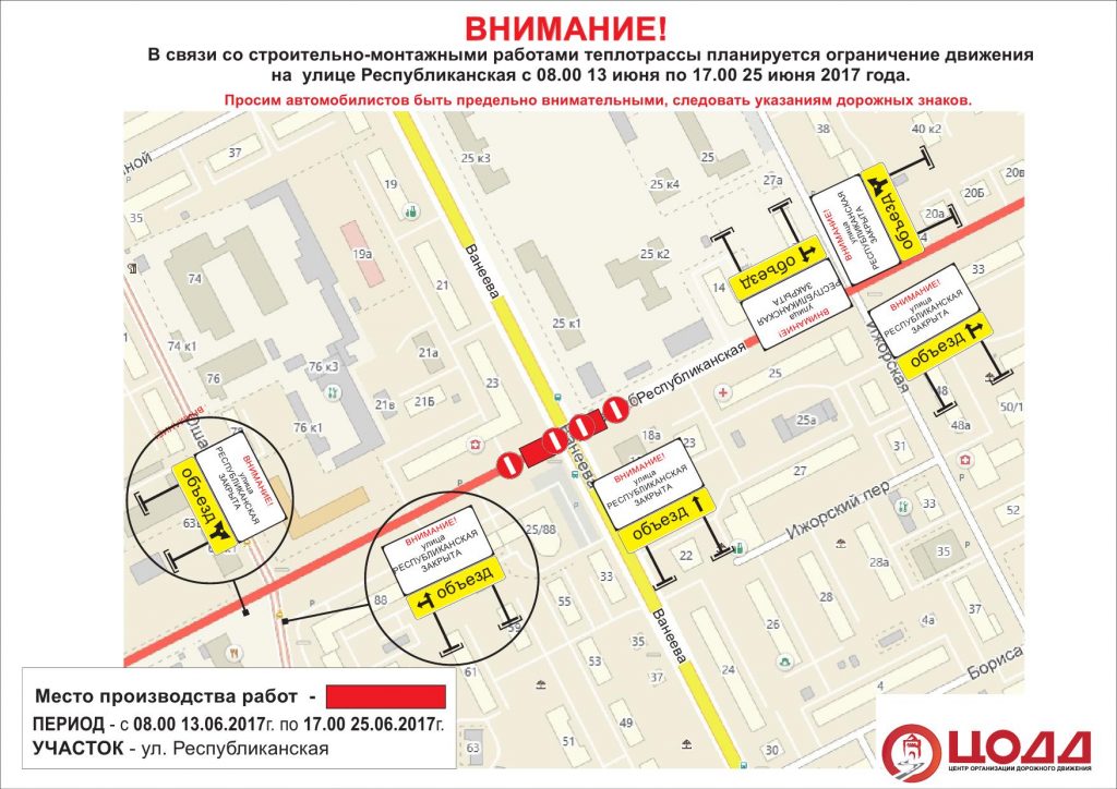 Также с 20:00 16 июня по 05:00 19 июня ремонтные работы будут вестись на перекрёстке ул. Ванеева и ул.Республиканская. При этом ул. Республиканская будет закрыта с 08:00 13 июня по 17:00 25 июня. Ограничения вводятся в связи со строительно-монтажными работами теплотрассы.