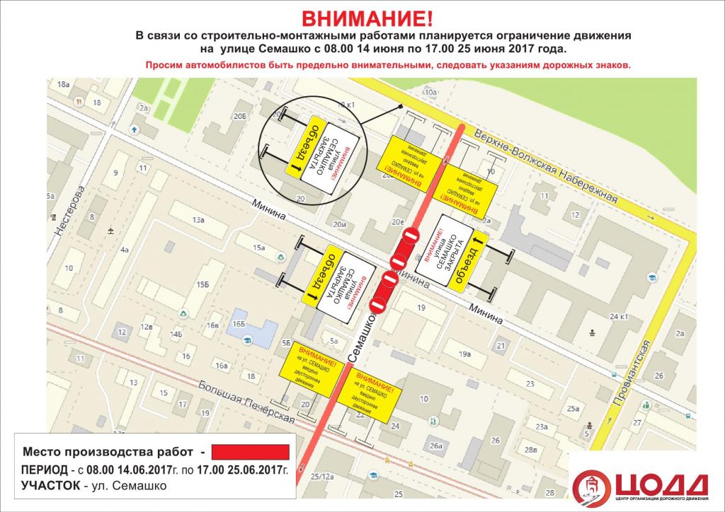Перекрёсток ул.Минина и ул.Семашко будет закрыт в связи со строительно-монтажными работами также с 22:00 16 июня по 05:00 19 июня. Кроме того, движение по ул. Семашко будет закрыто с 08:00 14 июня по 17:00 25 июня.