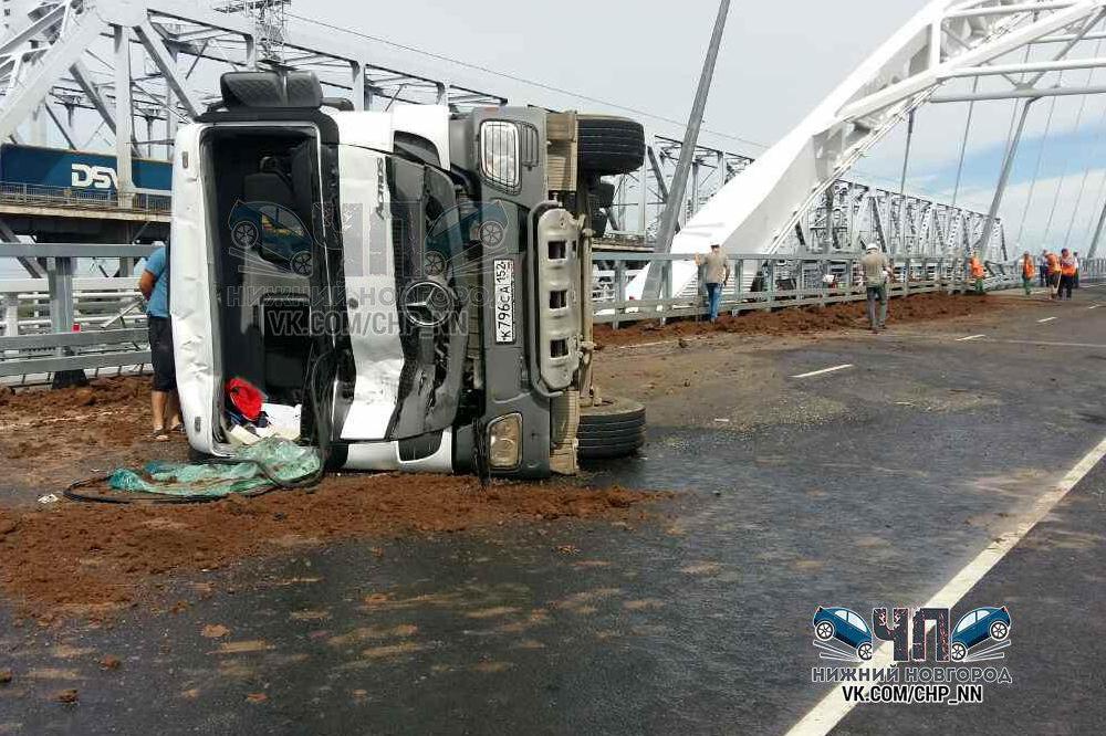 Гружёный грузовик перевернулся на новом Борском мосту в Нижнем Новгороде 26 июля 2017 года. Об этом сообщает очевидец с места событий.