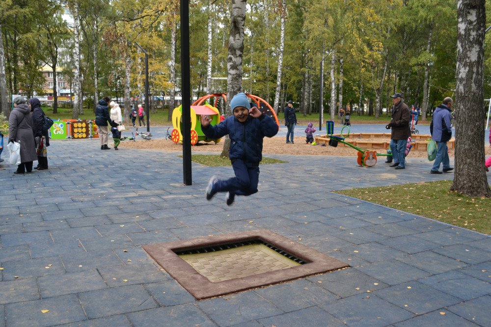 На детской площадке сделали экспериментальное мягкое покрытие из резиновых плиток, яркие разноцветные детские городки и маленький батут.
