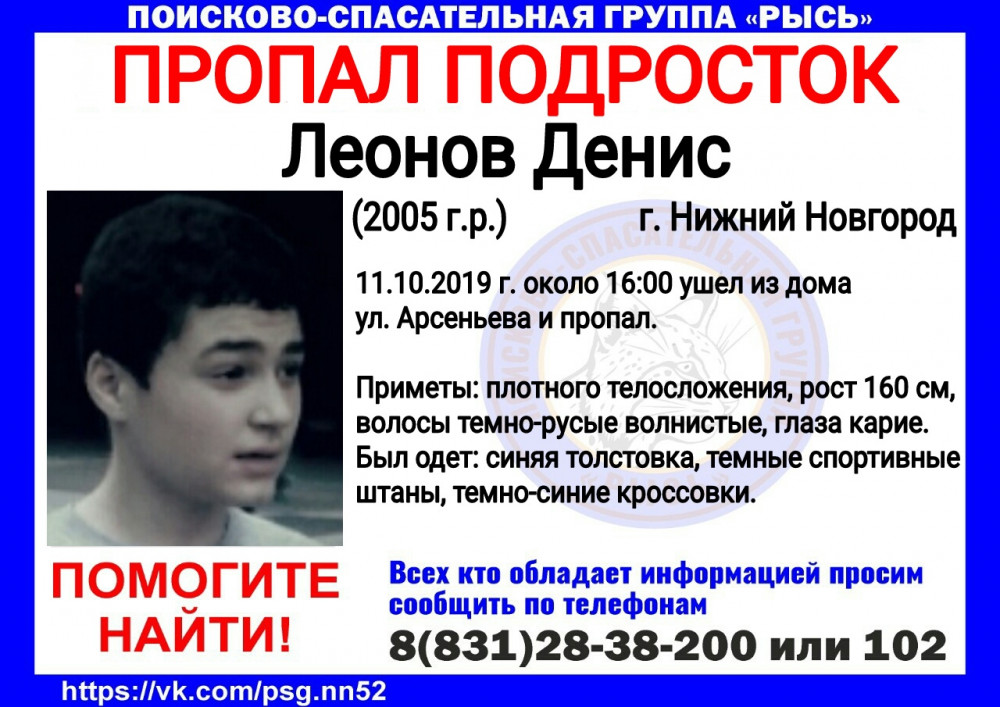Волонтеры просят помощи в поиске пропавшего в Нижнем Новгороде 14-летнего Дениса Леонова.