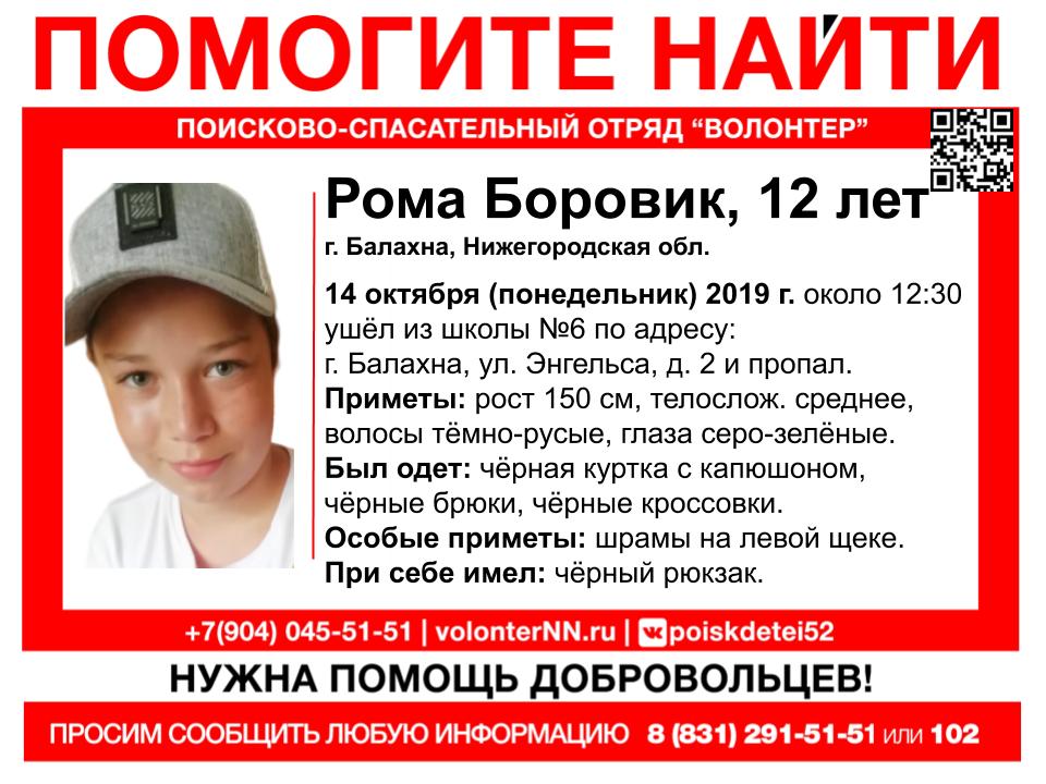 Волонтеры просят помощи в поиске пропавшего в Балахне 12-летнего Ромы Боровика. Как сообщает ПСО "Волонтер", общий сбор объявлен 15 октября 2019 года. Найден живым.