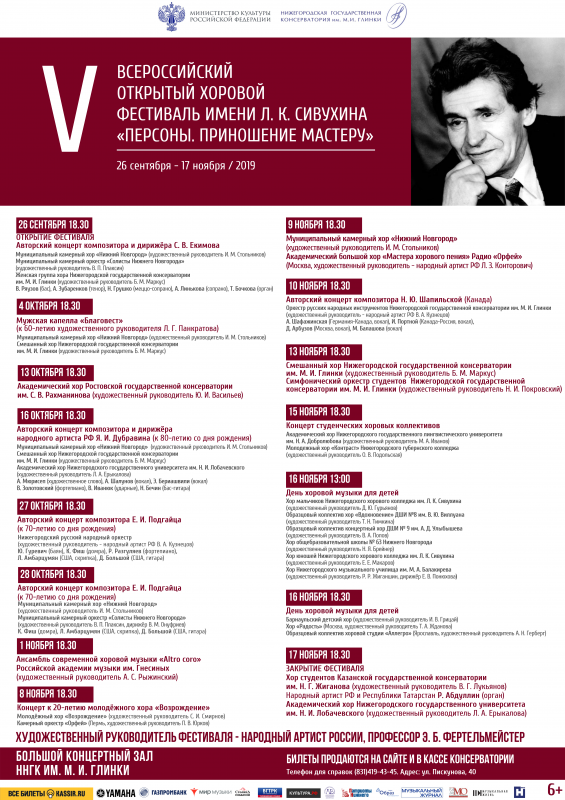 V Всероссийский открытый хоровой фестиваль им. Л.К. Сивухина "Персоны. Приношение мастеру" проходит в Нижегородской государственной консерватории им. М.И. Глинки до 17 ноября 2019 года. Как рассказали в информационной службе консерватории, в этом году в фестивале принимают участие более тысячи музыкантов из России, а также США, Канады и других стран.