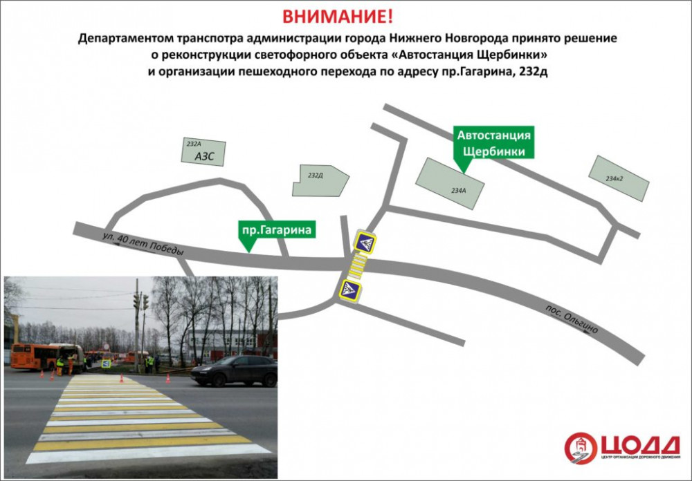 Новый пешеходный переход появится у автостанции Щербинки. Об этом сообщается на сайте Центра организации дорожного движения Нижнего Новгорода.