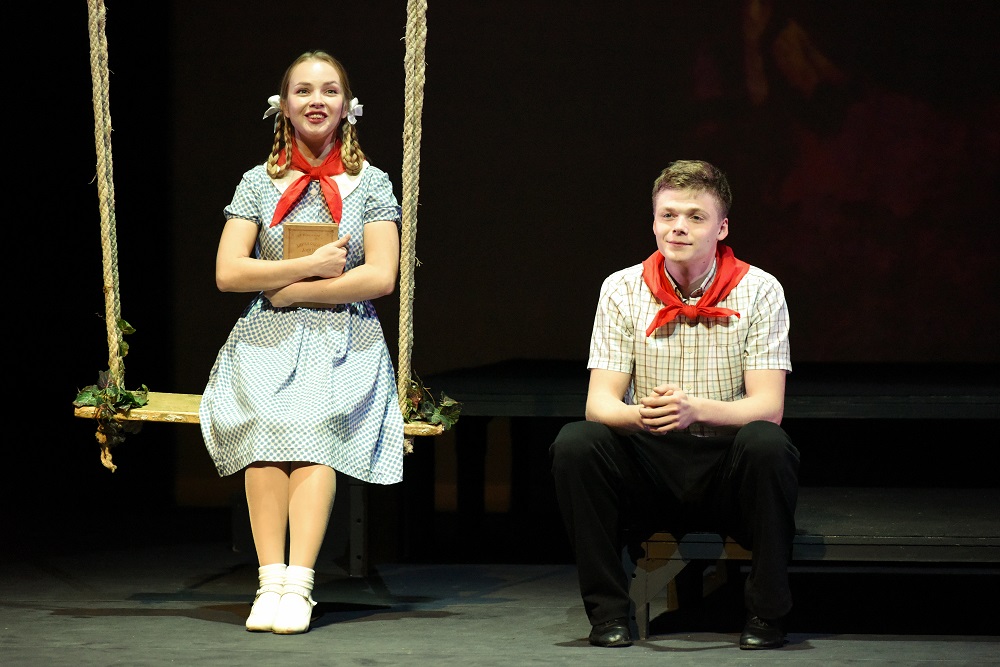 (Отрывок из спектакля "Дикая собака Динго", наставник: А. Чухнов, фото: Дмитрий Косолапов)Зрители следили как фрагменты из видеоархива плавно перетекают в реальные сцены, сыгранные актерами Нижегородского ТЮЗа, как молодые актеры сменяют на сцене своих предшественников.