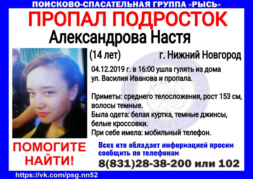 Информацию о местонахождении Насти можно сообщить по телефонам: 8 (831) 28-38-200 или 102.