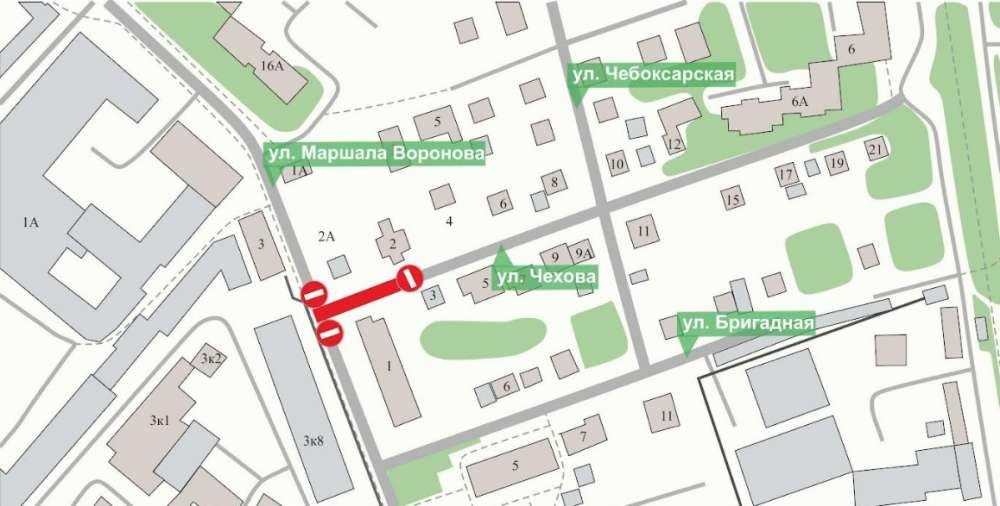 Согласно информации, движение транспорта на участках улицы Маршала Воронова напротив дома №3 корпус 1 и улицы Чехова от дома №2 до ул. Маршала Воронова будет приостановлено в связи с ремонтными работами на инженерных сетях с 8:00 20 июня до 23:59 27 июля.