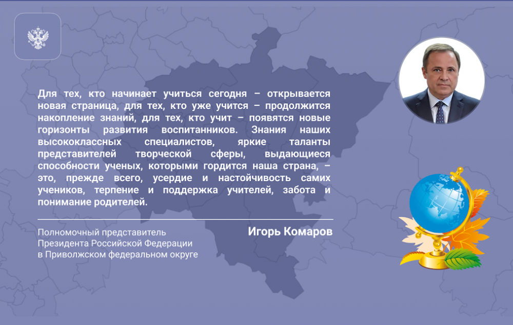 Полномочный представитель президента РФ в Приволжском федеральном округе Игорь Комаров направил поздравление с Днем знаний.