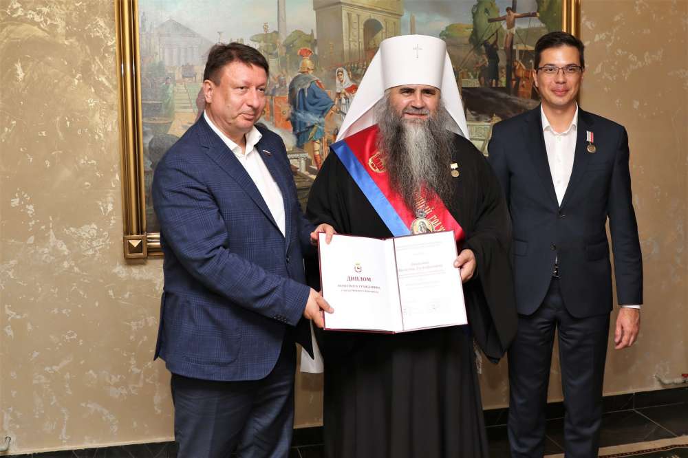 Председатель городской Думы Нижнего Новгорода Олег Лавричев и мэр Юрий Шалабаев вручили удостоверение, знак отличия и нагрудную ленту Почетного гражданина Нижнего Новгорода митрополиту Нижегородскому и Арзамасскому Георгию.