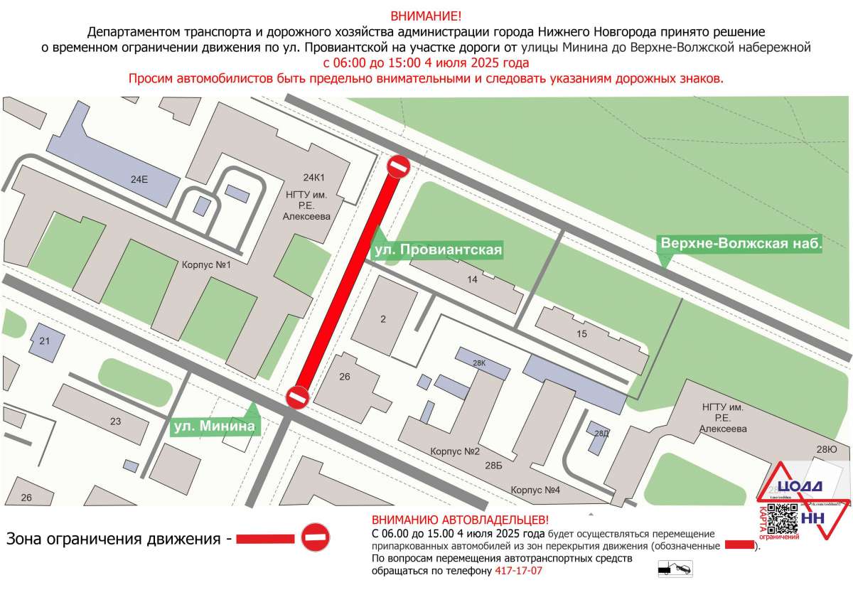 Часть улицы Провиантской перекроют в Нижнем Новгороде с 6:00 до 15:00 4 июля, передает пресс-служба городской администрации.