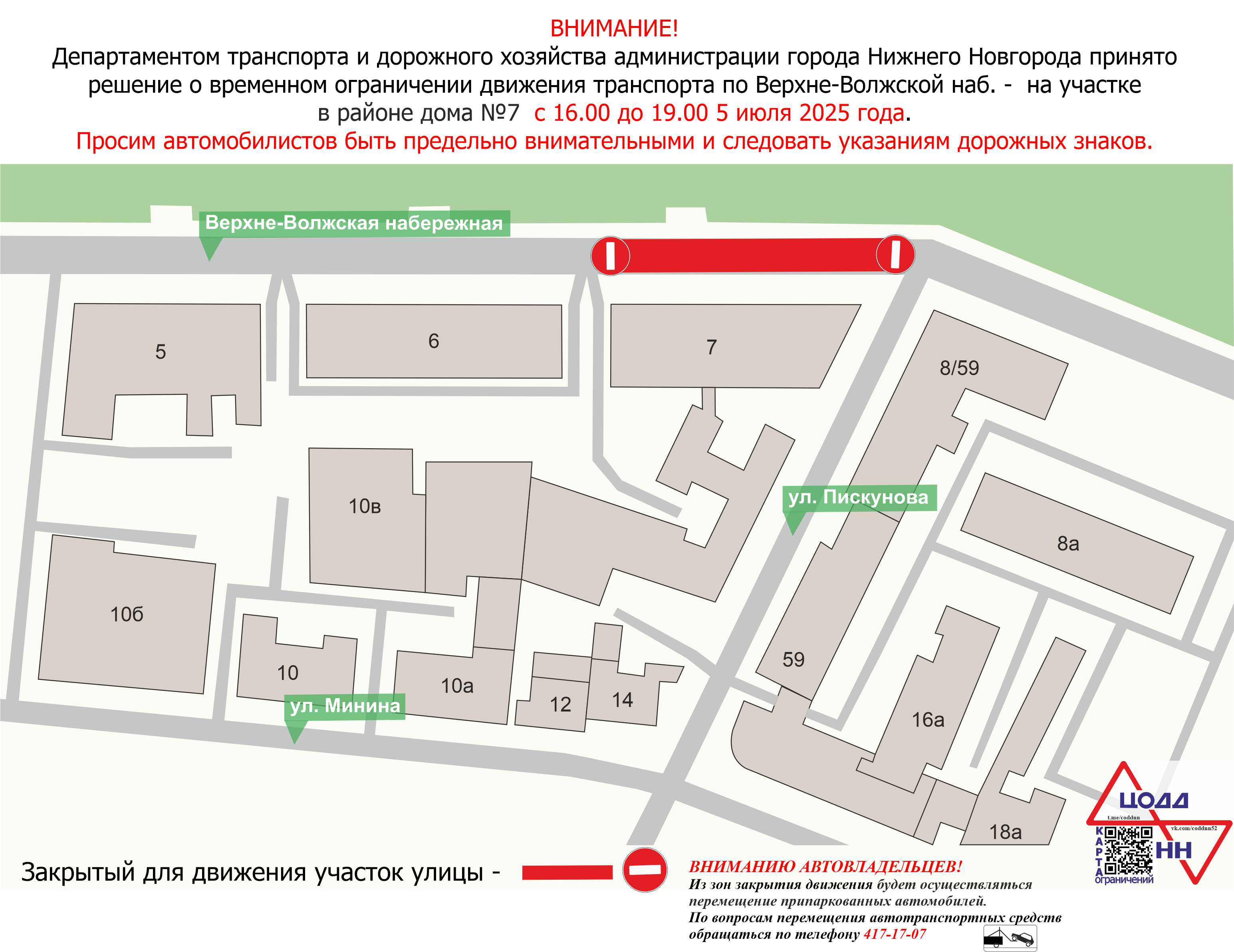 Первое перекрытие запланировано на 5 июля. С 16:00 до 19:00 движение будет приостановлено по Верхневолжской набережной в районе дома №7.