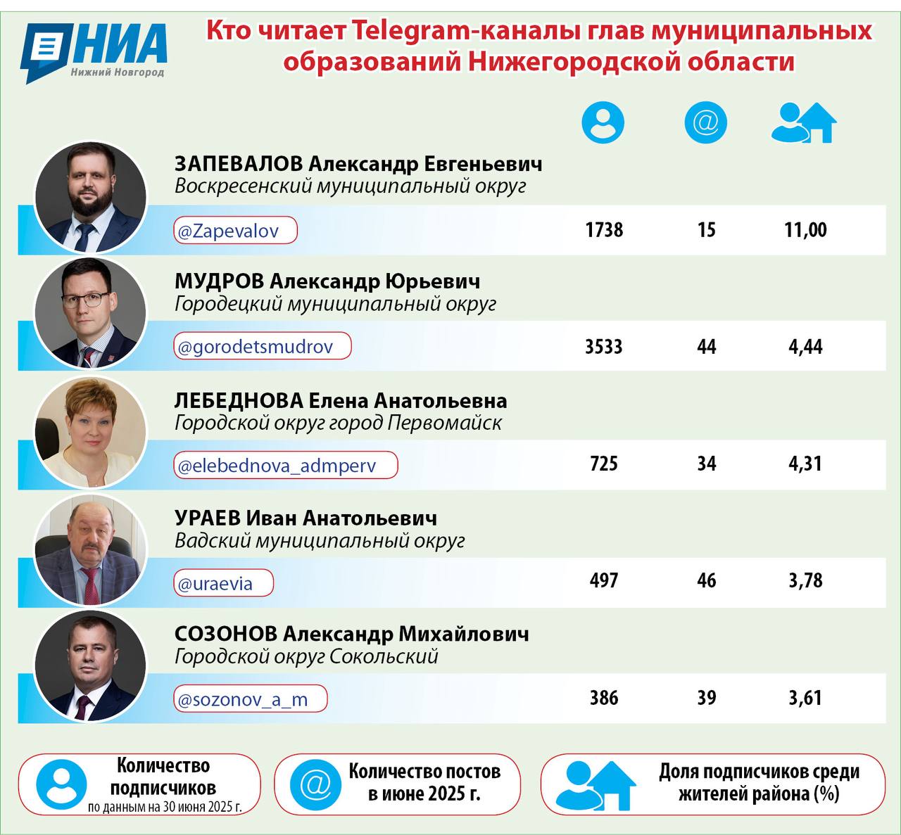 Телеграм-активность нижегородских глав разная: от каналов с десятками тысяч просмотров — до почти мертвых площадок. Лидерами по числу подписчиков являются глава Нижнего Новгорода Юрий Шалабаев (9769), глава Городецкого района Александр Мудров (3533), глава Дзержинска Михаил Клинков (2133), глава Арзамаса Александр Щелоков (1908) и глава Воскресенского округа Александр Запевалов (1738). Все данные актуальны на 1 июля 2025 года.