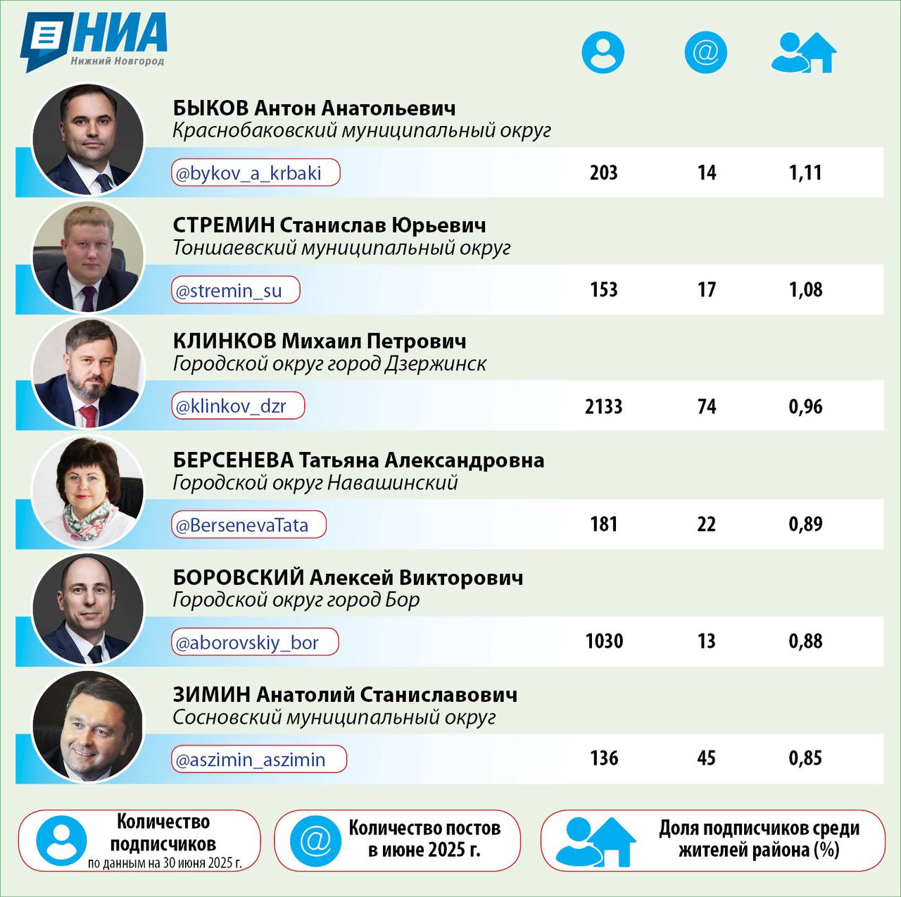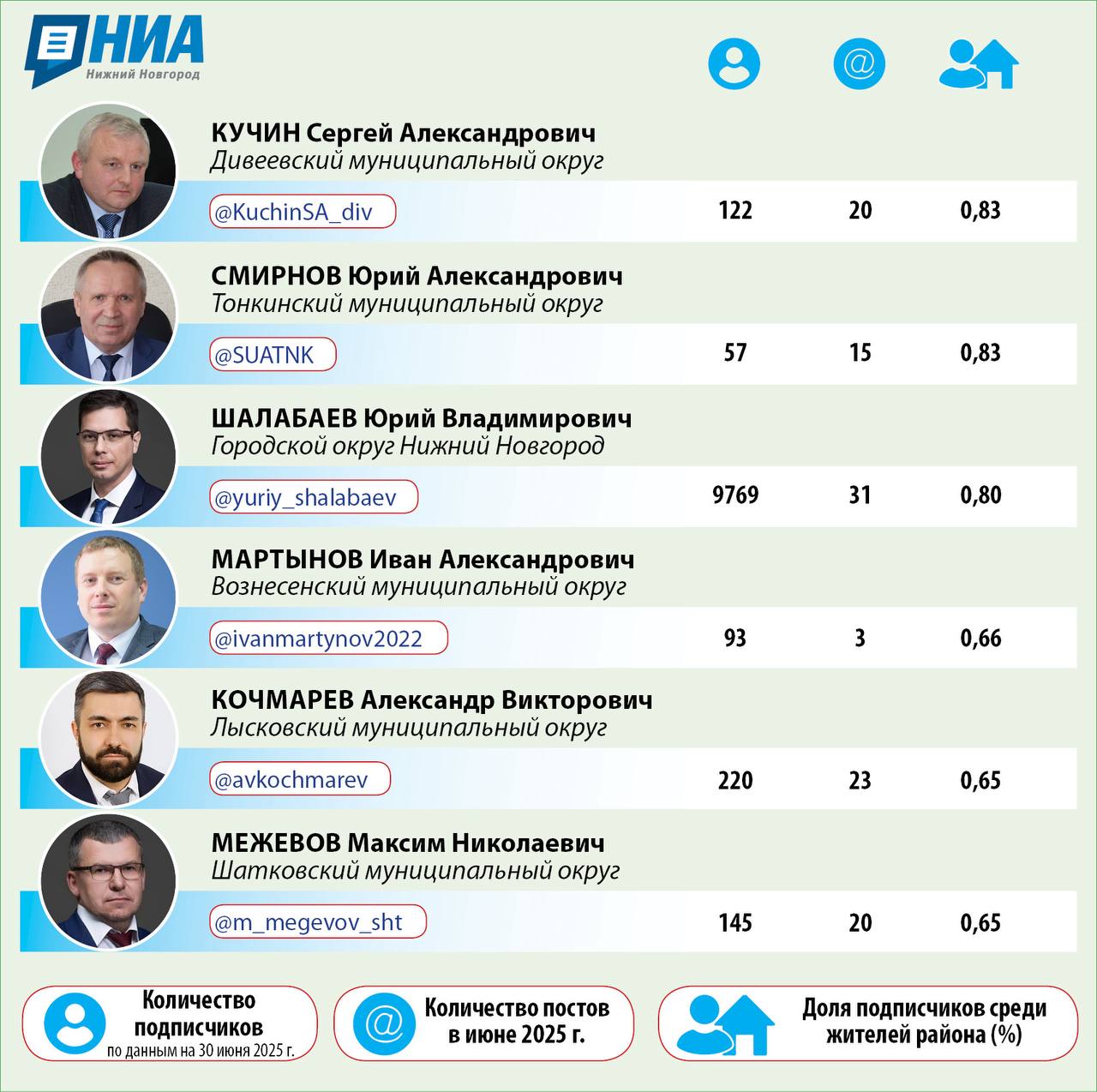 1. Юрий Шалабаев — 9769 подписчиков, 31 пост в июне 2025 года, средний охват одного поста — 6492, население муниципалитета — 1 222 122 человек, доля подписчиков — 0,80%.