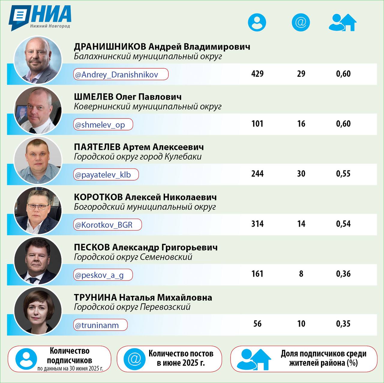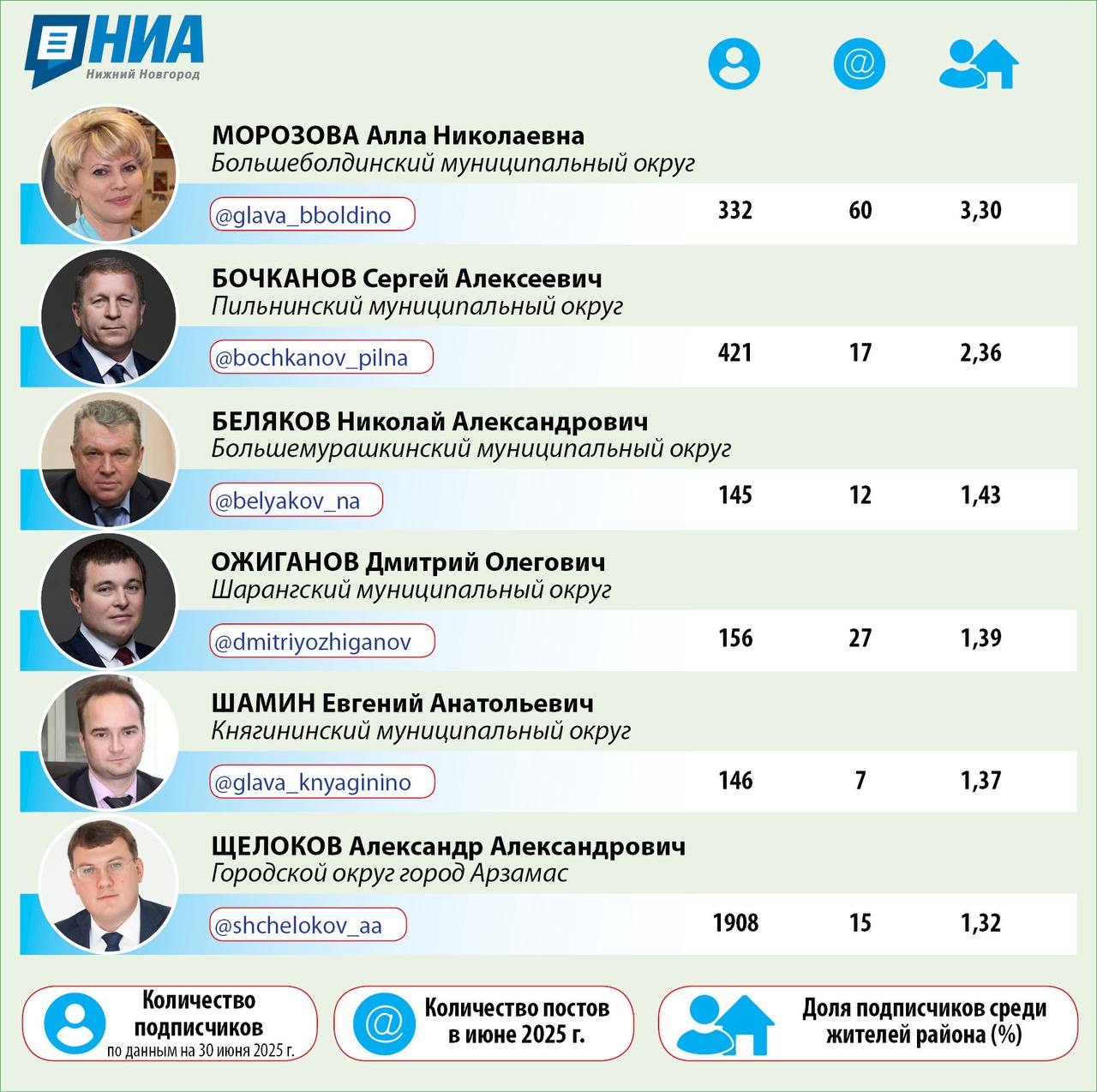 Так называемый "второй эшелон" — это главы районов, у которых число подписчиков колеблется от 300 до 750 человек. В этом списке, например, Елена Лебеднова (Первомайск, 725 подписчиков), Иван Ураев (Вадский округ, 497), Андрей Дранишников (Балахнинский район, 429), Александр Созонов (Сокольский округ, 386), Сергей Бочкарев (Пильнинский округ, 421), Алексей Коротков (Богородский округ, 314).