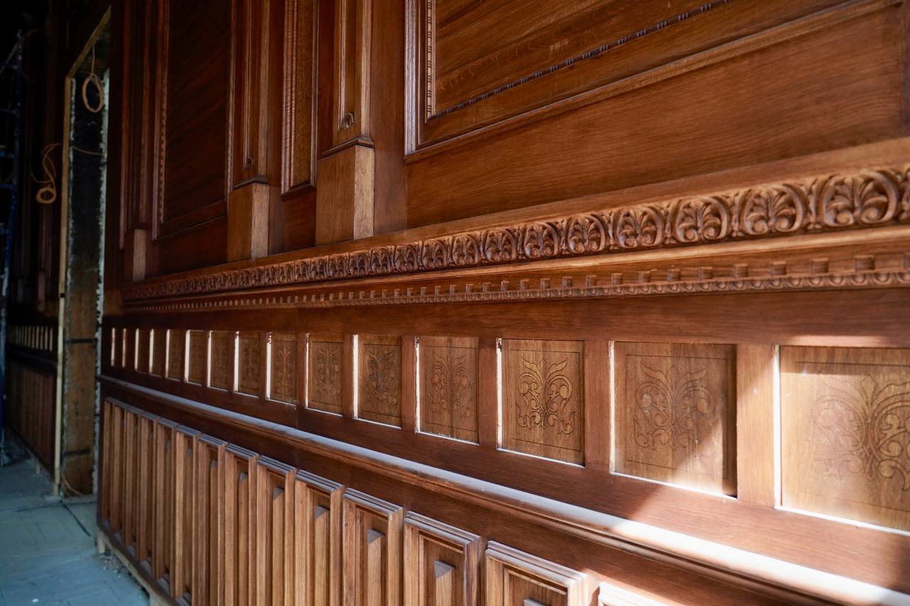 Работы активно идут и в других помещениях. В Большом дубовом зале завершается обшивка стен: большая часть деревянных панелей — это оригинальные элементы, прошедшие реставрацию. Для зала также изготавливают люстры и бра.
