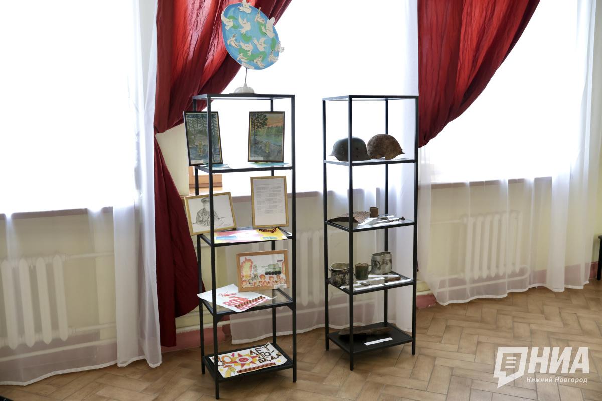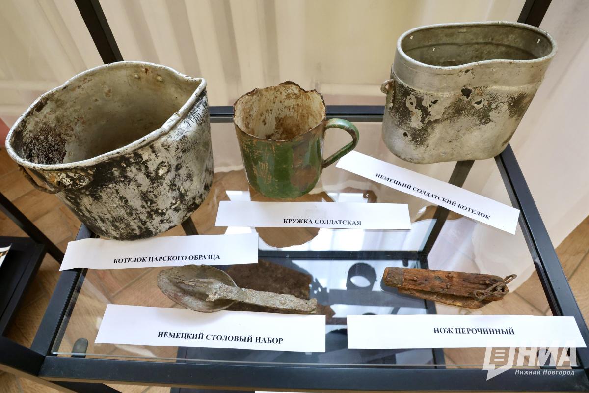 Дополняет экспозицию подборка подлинных предметов времен войны, предоставленных нижегородской поисковой организацией "Курган". Среди экспонатов — каски, котелки, саперная лопатка и другие находки с полей сражений.