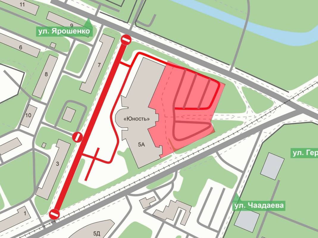 С 15 по 17 августа нельзя будет проехать по площади у Дворца спорта "Юность" и по улице Ярошенко — от дома № 7 до дома № 3.