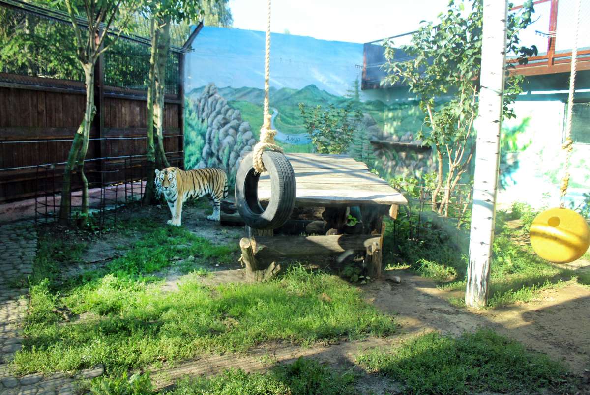 Открытая часть вольера также претерпела изменения. Здесь появился деревянный подиум для отдыха и новые игрушки — подвешенная шина и прочный мяч, внутрь которого сотрудники зоопарка прячут угощения. Такие приспособления помогают тигру развивать ловкость и поддерживать активность.