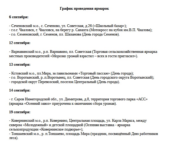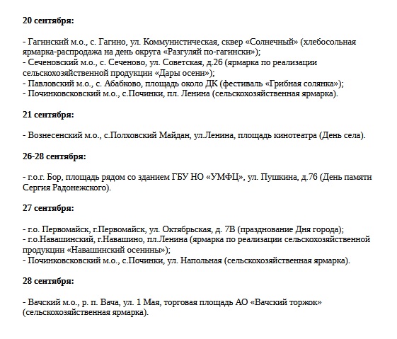 Первые осенние ярмарки стартуют 6 сентября в Сеченовском и Семеновском округах, а также в Чкаловске. Там будут представлены продукты питания, изделия народных промыслов и товары ручной работы по ценам от производителей.