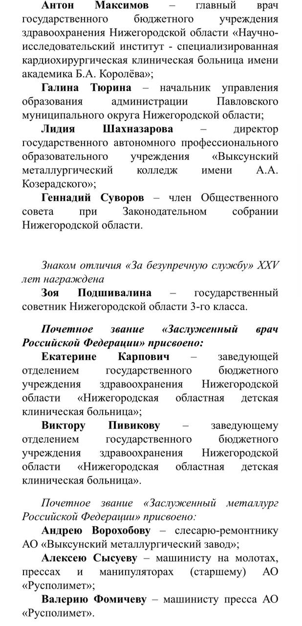 19 сентября 2025 года заместитель губернатора Нижегородской области Андрей Гнеушев вручил государственные награды 48 жителям региона. Торжественная церемония состоялась в музее-усадьбе Рукавишниковых.