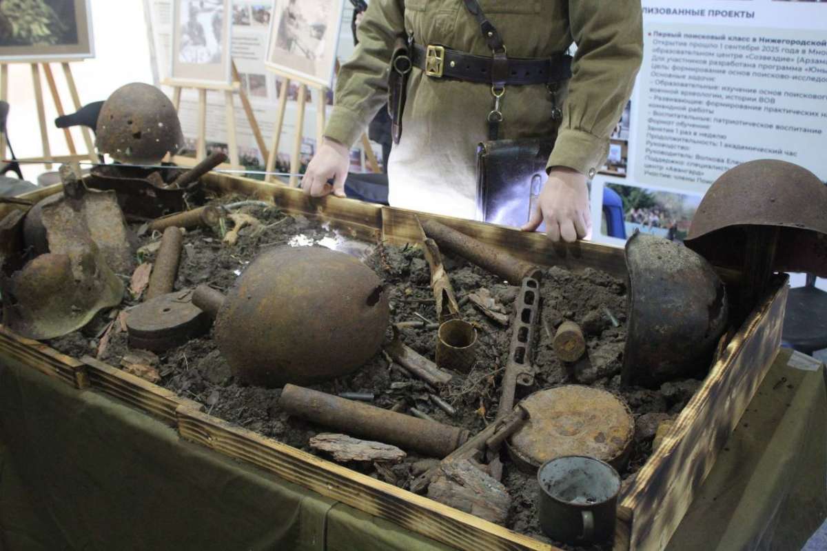 Особое внимание привлек стенд, оформленный нижегородскими поисковиками. Он включал каски и сапёрные лопаты, найденные в деревне Рамушки Новгородской области. По словам самих участников, именно там удалось обнаружить больше всего артефактов, поскольку территория Нижегородской области в годы войны подвергалась меньшему разрушению.
