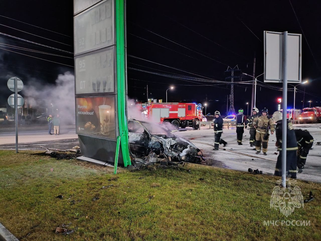 На опубликованных снимках видно, что машина выгорела полностью и не подлежит восстановлению. Также повреждения получили и объекты, расположенные на автозаправке.