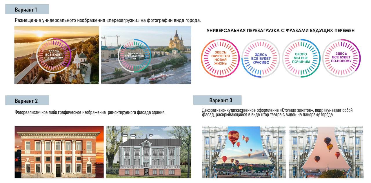 Отдельное внимание уделено оформлению фальшфасадов на зданиях, находящихся на реконструкции. Предложены три варианта визуального решения: