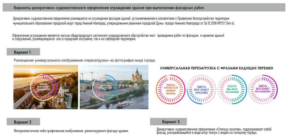 В случае проведения фасадных работ предусмотрено декоративно-художественное оформление ограждений. Оно может включать фотореалистичные изображения ремонтируемых зданий или стилизованные визуальные решения с позитивными слоганами вроде "Здесь все преобразится" и "Скоро мы все починим".