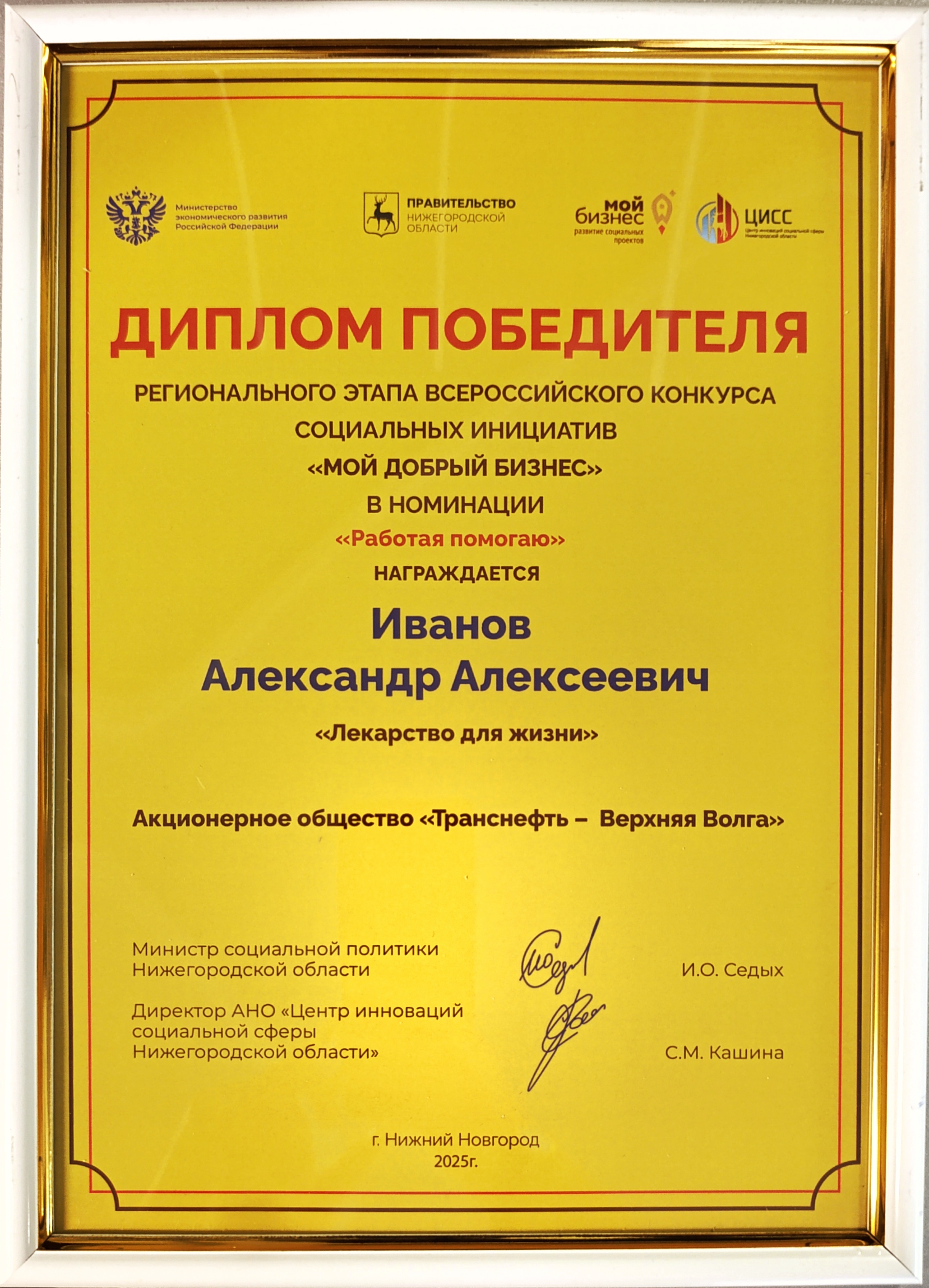АО «Транснефть – Верхняя Волга» заняло первое место в региональном этапе Всероссийского конкурса «Мой добрый бизнес» в номинации «Работая помогаю». Победу принес социальный проект «Лекарство для жизни» (0+).