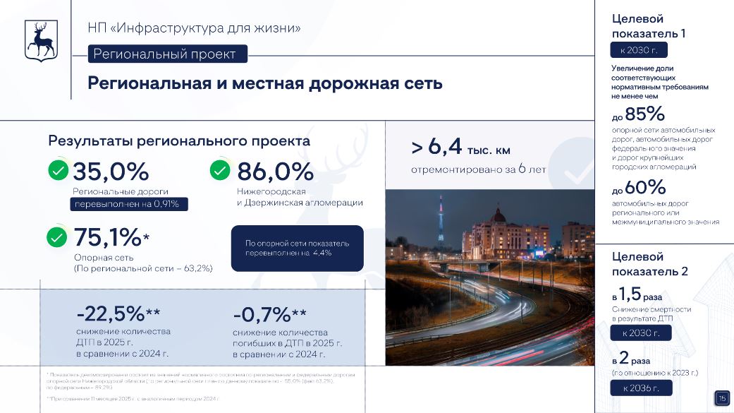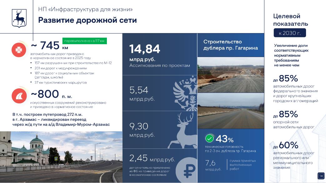 В Нижегородской области в 2025 году по нацпроекту "Инфраструктура для жизни" отремонтировали более 745 км дорог при плане 626 км. Это на 60% больше, чем годом ранее. Об этом 22 декабря на итоговом заседании регионального правительства сообщил замгубернатора Сергей Морозов.